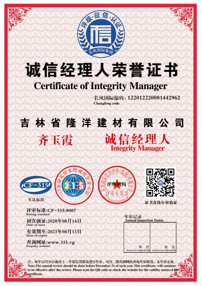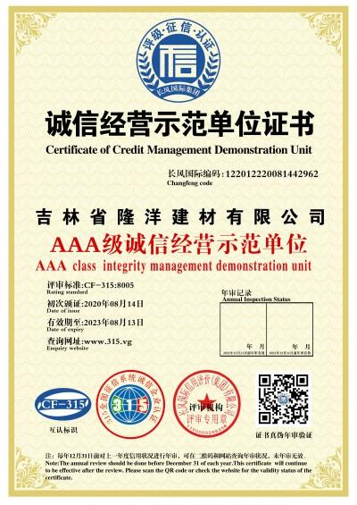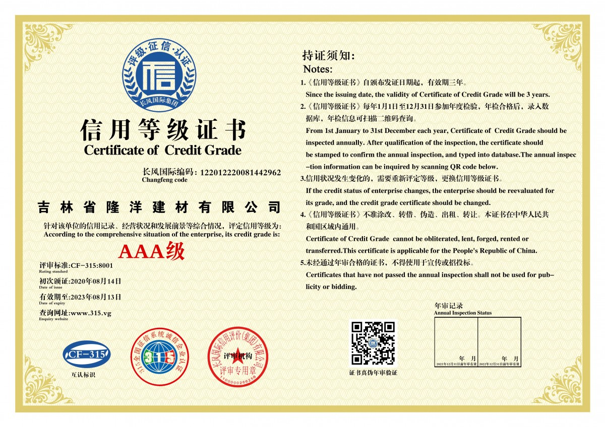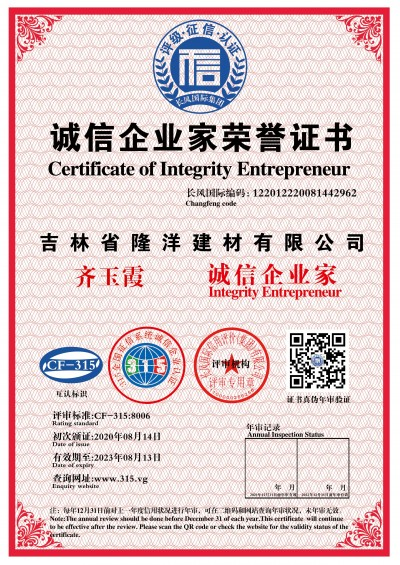 1.是吉林省隆洋建材有限公司生态安全与科技创新 “发明专利”;发明专利号:ZL 2019 2 2343923.8。